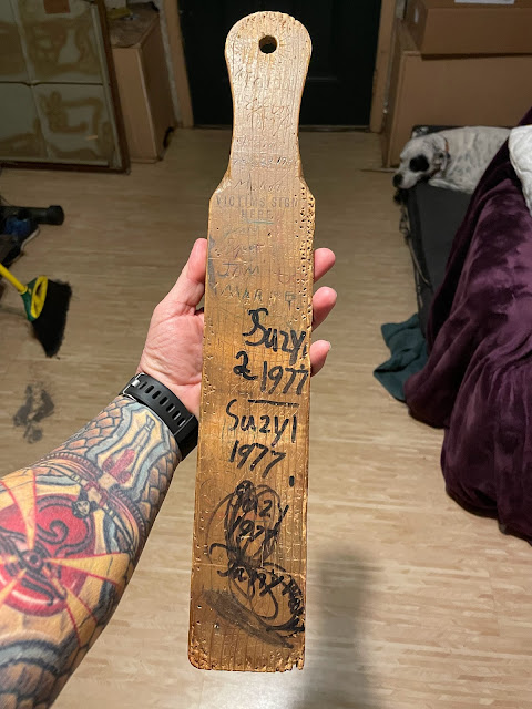 That is my Grandmother's paddle. The special thing about it is that it has all the names of my relatives on it for each time they were paddled. That Suzy is my cousin who subbed in her dogs name, which cracks me up beyond anything you could imagine. My Grandmother would tell me each time I was visiting that this would be the time that I sign my name to the paddle, but it never happened. See I was a really good kid, and I also saw it as a challenge to not get my name on it, so I was always on my best behavior, whic is more than likely what my Grandmother truly had in mind. She was a sneaky old broad, and I use that in the most affectionate of ways. She was a pro at reverse psychology. On one of my last visits up there before she died, she told me that if I could keep my name off the paddle, that it would be mine when she passed on. When she passed it wasn't even on my mind, because when I went there for her funeral, I was so broken and devastated that I didn't even think about the paddle, but when time came to think about it we always got some strange replies, so I had fully believed that my cousin had thrown it in the trash burning barrel, because she hated it. I had totally given up hope that it still existed and didn't even mention it to my cousin when we reconnected. Well, my sister who doesn't believe in giving up got word to my cousin and she reached out to me with an exchange deal. The paddle for a picture. I will be shipping the picture out this week to fulfill my part of this exchange, but I finally have my paddle.